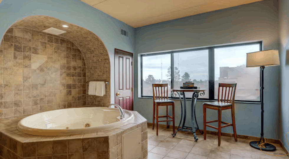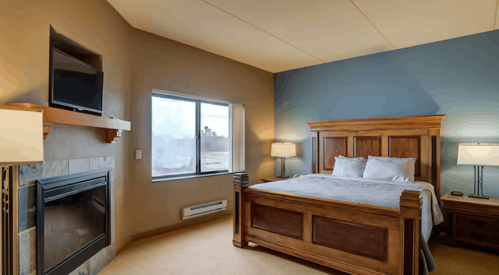 Unwind in a luxurious king bed with plush linens, extra pillows, and cozy blankets. Enjoy your own electric fireplace for added warmth and ambiance, along with a spacious layout, ample storage, and room-darkening shades for a restful night’s sleep. Features an En Suite Bathroom and electric fireplace.
